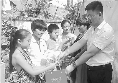 9月4日,滕州市爱心人士任法众带着月饼、米面等物品,来到羊庄镇羊东村看望特困村民陈庆梅一家,鼓励陈庆梅鼓起勇气,战胜病魔。据悉,连日来任法众已为10多户特困家庭捐献爱心月饼等物资达5000余元。 (记者 张华 摄)