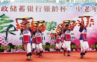 9月25日, 滕州市美铭广场人头攒动,热闹非凡,一群中老年广场舞爱好者正在表演《丰收的季节》这是“邮爱夕阳,和谐滕州”——滕州市第二届“邮储银行银龄杯”中老年广场舞大赛在这里举行,来自全市的55支队伍近千人参加比赛,充分展示了滕州中老年人青春活力与风采。