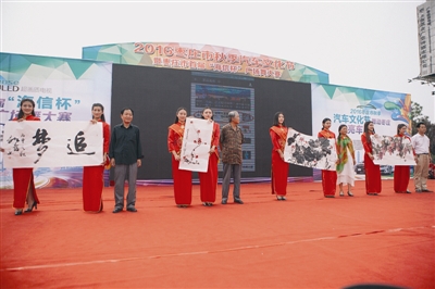 图④当日,4名爱心艺术家在现场即兴挥毫,创作书画作品当场义卖,众多爱心车商积极认购,所有款项均捐给吴秀丽一家。 (本报记者 甄宗奎 马高超 摄)