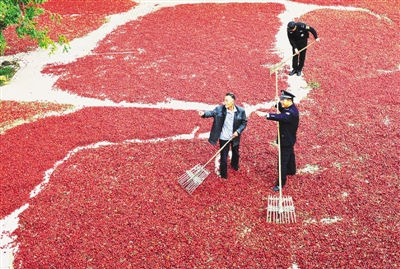 金秋十月,正是峄城区阴平镇大枣收获的时节,阴平社区警察中队联合派出所开展了守护枣农行动。他们在枣园的重要路段和路口安装了太阳能警灯和216个监控探头,并组织专职和义务巡防队对晾晒场及仓库周围进行日夜巡防。图为警察与枣农一起唠家常、晒大枣、宣防范。 (孙启路 杨明 摄)