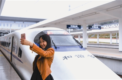 11月7日,55503次高铁列车抵达万州北站,一名女孩在高铁列车前用手机自拍。