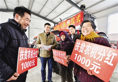 11月23日,泥沟镇胡洼村4户贫困村民(左)喜领1000元扶贫农机分红款。今年以来,台儿庄区投入专项扶贫资金370.5万元,为张山子镇、泥沟镇12个贫困村,购买大型农机具34台,采取“合作社+农机+贫困户”模式,除免费供贫困户使用,还定期向贫困户发放农机收益分红。截至目前,该区412名贫困人口已领取首批农机分红款12万余元。 (高启民 摄)