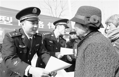 近日,市中公安分局组织民警到偏远农村集市“摆摊设点”,向赶集的群众宣传揭露新型网络传销的特点、危害和骗人伎俩以及防范方法等,提高广大群众识别新型网络传销的能力。图为民警在安城集市向群众分发传单。 (吉喆 贾方勇 摄)