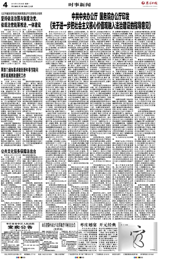 中共中央办公厅 国务院办公厅印发 《关于进一步把社会主义核心价值观融入法治建设的指导意见》