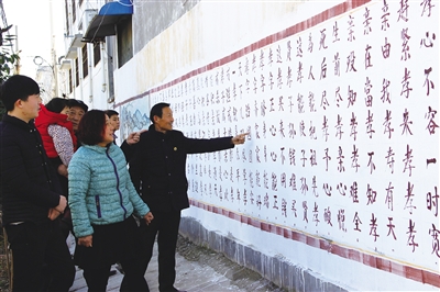 如今,“百孝墙”已经成了南刘庄居的一道风景线。外村人来到,总会停下脚步仔细揣摩,本村人也常常抱着孩子教导他们应该孝敬父母。“看了《百孝篇》,使我明白了百善孝为先的道理。作为晚辈,我们要在生活上多关心老人、理解老人、孝敬老人。”村民秦秀英看了“百孝墙”后说。