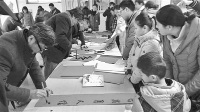 1月19日,市图书馆邀请我市书画家,为群众书写春联近300副,受到群众称赞。 (记者 王飞龙 摄)