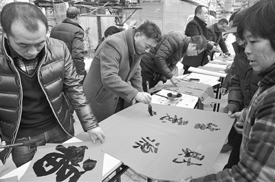1月18日,山亭区城头镇利用逢集日启动文化下乡活动。图为书法家现场为群众写春联。 (记者 王飞龙 摄)
