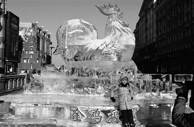 1月23日,在哈尔滨中央大街附近,一名小朋友在冰雕作品“金鸡报晓”前留影。