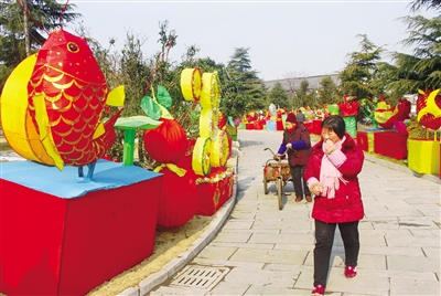 在张汪镇大宗村宗泽园,只见花灯造型各种各样,有《金鸡纳福》、《慧眼识才》、《荷塘月色》、《金龙迎春》等花灯,也有展现传统民俗的花灯《吉庆有余》等、还有展示新农村建设的《丰收的喜悦》等。记者看到,今年的花灯会以LED“光雕”灯为主,灯组围绕宗泽园湖布置,湖水倒映灯光,整个园区流光溢彩,吸引了众多游客观光。 (记者 侯志龙 摄)