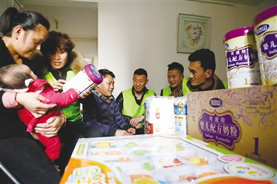 2月15日,山东儒泽宝贝蛋育婴连锁联合滕州残疾人温馨家园的会员,来到韩典友家中,为其儿子送来了奶粉、尿不湿、玩具等育婴物品。据了解,韩典友及妻子郝志峰均为二级重症残疾,两个月前其儿子出生后,妻子一直没有奶,而买奶粉的价格又太高,这可愁坏了韩家人。滕州残疾人温馨家园得知情况后,联系了山东儒泽宝贝蛋育婴连锁,并将首批价值4000元钱的育婴物品送到了韩家。 (记者 金亮 摄)