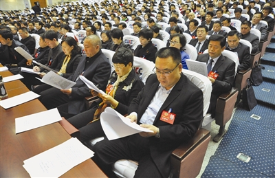 政协委员认真听取报告。 (记者 王飞龙 摄)