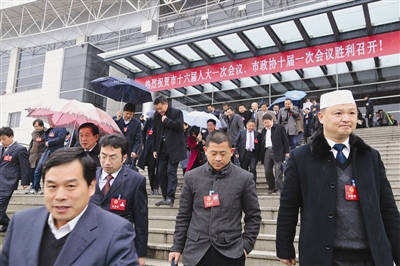 昨日,市政协十届一次会议闭幕。委员们满怀信心,步出会场。 (记者 王震 摄)