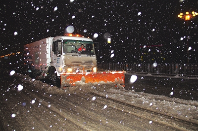② 2月21日下午,为保证市民平安出行,滕州市环卫处紧急启动应急预案,连夜出动6辆除雪车在城区北辛路、解放路、龙泉路等重要路段清扫积雪,并针对解放大桥、善国大桥、茂源大桥等易结冰路面抛洒融雪剂及工业盐,确保了市民安全出行。(记者 金亮 摄)