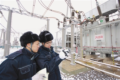 2月21日下午到夜间,我市出现大范围降雪,气温骤降。为保障居民可靠用电,枣庄供电公司迅速开展雪后重点变电设备特巡。图为:2月22日9:00,供电员工对220千伏建国变电站2号主变进行红外测温。 (蔺相斌 李森 摄)