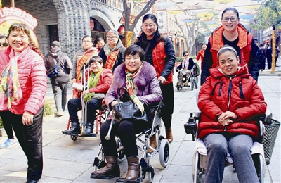 当日,徐州义工帮助40余名残疾人朋友到台儿庄古城游玩。台儿庄区义工协会组织多名义工协助,鲁苏两地义工携手,为残疾人朋友创建了无障碍通道。 (张严新 摄)