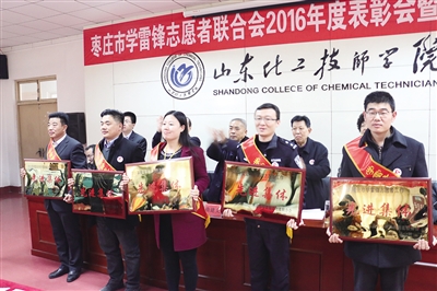3月1日,枣庄市学雷锋志愿者联合会 2016年度表彰会暨学雷锋现场会在山东化工技师学院召开。中华雷锋文化促进会副会长、枣庄市雷锋精神研究工作委员会常务副会长、雷锋班第四任班长曲建文,中华雷锋文化促进会理事、枣庄市雷锋精神研究工作委员会副会长、枣庄市学雷锋志愿者联合会会长傅延华,枣庄市雷锋精神研究工作委员会副会长王启金,滕州市关工委副主任刘玉荣,共青团滕州市委副书记颜景宁,山东化工技师学院副院长张继宏以及枣庄市学雷锋志愿者联合会各区(市)分会会长及受表彰的先进单位、个人代表参加了会议。
