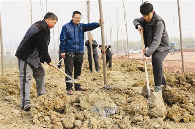 上图:3月11日,市中区光明路街道雷村群众在义务植树。