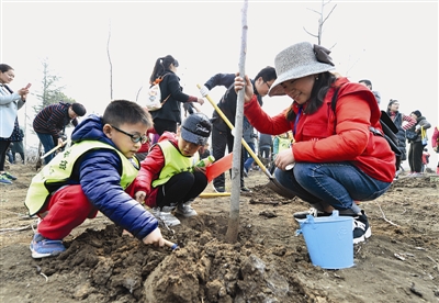 下图:3月11日,台儿庄区团委组织开展“亲子植树·牵手春天”爱树护树活动,60个家庭的小朋友与家长一同挖坑、植树、浇水,体验劳动的乐趣,增强植绿护绿的环保意识。