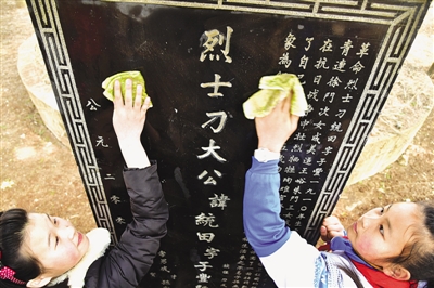下图:3月31日,山亭区水泉镇东河小学学生在擦洗烈士墓碑,用低碳文明的朴素方式寄托哀思,缅怀先烈。