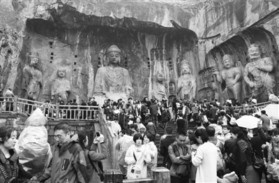 4月4日,游客冒雨游览河南洛阳龙门石窟。据国家旅游局数据中心综合测算,清明假日期间,全国旅游市场共接待游客0.93亿人次,实现旅游总收入390亿元。 (新华社发)