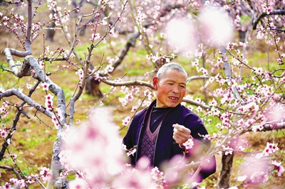 下图:山亭区水泉镇万亩大红桃基地里,果农进行人工疏花、授粉等精细管理。