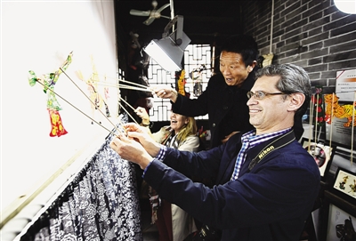 台儿庄古城依托抗战文化、运河文化、鲁南民俗文化等资源,打造特色文化旅游,吸引了众多海内外摄影家和艺术家前来采风。4月6日,在台儿庄古城景区,国际摄影艺术联合会秘书长利库里斯饶有兴趣地玩起了皮影。 (高启民 摄)