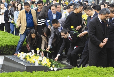 右图:社会各界人士向台儿庄大战无名烈士墓敬献鲜花。