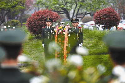 左图:武警战士向台儿庄大战无名烈士墓敬献花篮。