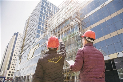 4月11日,在荆河街道中万国际广场施工现场,工作人员正在对外层建筑结构进行统计。据了解,今年以来,荆河街道主动担当推进重点城建项目建设,其中,中万国际广场、银座东馆升级、居然之家商贸综合体等项目的快速推进,吸引了一大批品牌服务业项目,让荆河成为了品牌服务业项目聚集区和区域性商贸中心,大大增强了城市经济发展活力。(记者 金亮 摄)