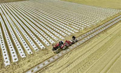 →4月18日,河北省威县陈固村农民在使用机械设备播种棉花。