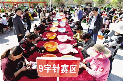 4月18日,台儿庄区泥沟镇第四届农民来料加工技能大赛开赛。55个行政村的180位来料加工能手参加了中国结编织、合包、串珠等6个项目的比赛,吸引了众多村民观看。 (高启民 摄)