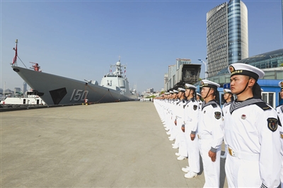 当日,人民海军成立68周年之际,由导弹驱逐舰长春舰、导弹护卫舰荆州舰和综合补给舰巢湖舰组成的远航访问编队,上午从上海黄浦江畔启航,将赴亚洲、欧洲、非洲和大洋洲的20余个国家进行为期近180天的友好访问。这次任务是人民海军历史上访问国家最多、出访时间最长的一次远航访问。 (新华社发)