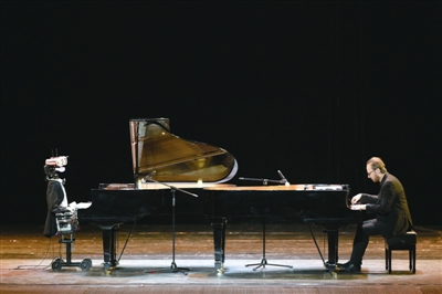 当日,为期两天的“未来世界的键盘手——钢琴机器人全能挑战古典音乐大师经典作品音乐会”在天津津湾大剧院上演。拥有53根“手指”的机器人特奥特劳尼克(Teotronica)与意大利钢琴家罗伯托·普罗塞达一同登场献艺,让观众感受音乐与科技的奇妙碰撞。 (新华社发)
