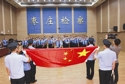 6月8日,市检察院的检察官在国旗前庄严宣誓。当日上午,我市检察机关举行首批入额检察官集体宣誓就职仪式。目前,全市检察官入额遴选工作已经顺利完成。 同日上午,我市两级法院的313名员额法官也举行了入额宣誓就职仪式。