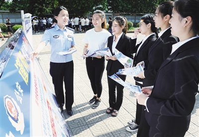 6月7日,枣庄学院、市公安局、中国人民银行枣庄市中心支行联合开启全民防骗 “益”呼百应防范电信网络诈骗集中宣传月活动,针对电信网络诈骗的最新动态和手段特点,向青年学生传授防骗知识,提出防范建议。图为民警正在向大学生讲解电信网络诈骗的种类及危害。 (记者 刘品 摄)