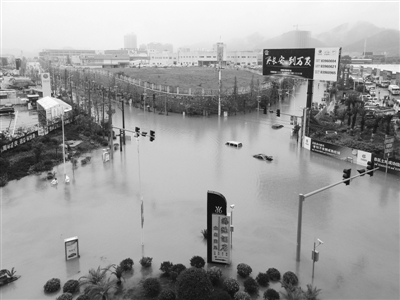 ←6月12日,贵阳市孟关汽车贸易城路段积水严重。6月11日起,贵州多地遭遇强降水天气,部分城市低洼路段出现积水,给人们出行带来不便。 (新华社发)