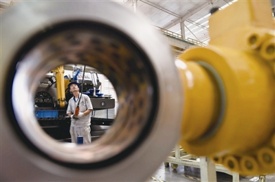 6月16日,在山东临工工程机械有限公司,工人在挖掘机生产线作业。