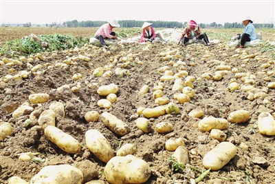 6月14日,城头村农民帮助本村土豆种植大户收获土豆。