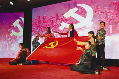 上图:6月27日下午,枣庄高新区举办“党性教育大讲堂”活动,500余名党员干部观看了《绣红旗》等歌舞剧,并一起重温入党誓词。 (记者 孔浩 摄)