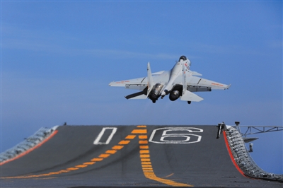 7月1日,一架歼-15舰载战斗机从辽宁舰滑跃起飞。