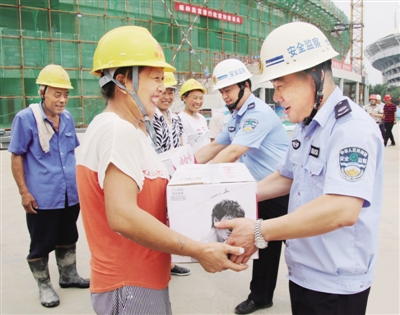 7月25日,滕州市建工局人员正在市冯河小学、奥体游泳馆施工现场,为辛勤工作在高温一线的建筑工人送绿豆、西瓜等防暑降温物品。针对连续高温天气,市建工局开展了施工一线“送清凉”活动,确保建筑工人安全度夏。 (记者 侯志龙 特约记者 刘书伟 通讯员 张明 摄)