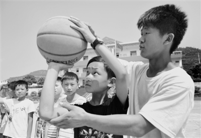 7月24日,“留守学堂”里,大学生志愿者(右)教留守儿童打篮球。