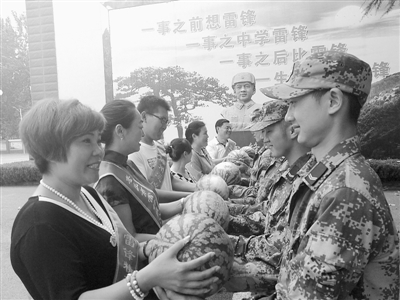 7月26日上午,市雷锋精神研究会的爱心人士给驻枣72825部队的官兵送去西瓜等慰问品,并祝官兵“八一”节快乐,鼓励他们苦练军事技能,再立新功。 (记者 张华 摄)