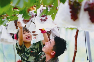 8月13日,在江苏省公安边防总队综合保障基地农场,一名小女孩在边防战士的帮助下体验摘葡萄。