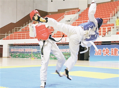 8月11日,由枣庄市人民政府主办,枣庄市体育局、滕州市人民政府承办的枣庄市第九届运动会青少年组跆拳道比赛在滕州市体育馆拉开战幕。在为期2天的赛事中,有来自五区一市6支代表队的142名选手进行了激烈的对抗角逐。据了解,本次比赛共设男、女(甲、乙)4个组别,32个级别。比赛按照国家体育总局审定的最新《跆拳道竞赛规则》,采用单败淘汰制,三人参赛的级别采用循环赛制。比赛中,选手们发扬“礼仪、廉耻、克己、忍耐、百折不屈”的跆拳道精神。生龙活虎,勇敢进攻、积极防守,劈力精准、精彩的360度后旋踢等高难度动作,博得了观众的阵阵喝彩。 (记者 侯志龙 摄)
