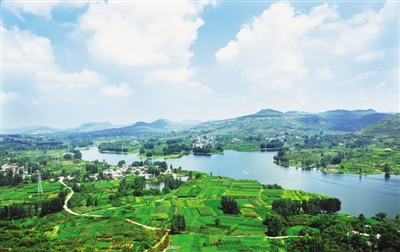 8月20日,山亭区翼云湖畔的小山村在蓝天白云映衬下格外美丽。