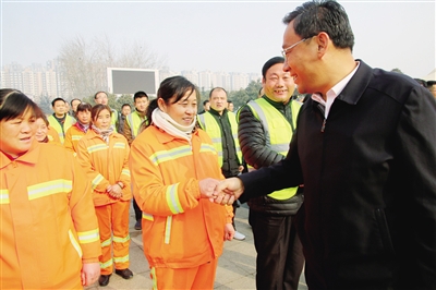 1月1日上午,滕州市委书记邵士官到滕州市龙泉广场看望了环卫工人,并向环卫工人送上新年的祝福。滕州市委常委、市委办公室主任薛登峰,滕州市副市长、公安局长梁龙雨,滕州市副市长刘新以及市委办公室、市综合行政执法局、住建局等有关部门负责人等参加了活动。