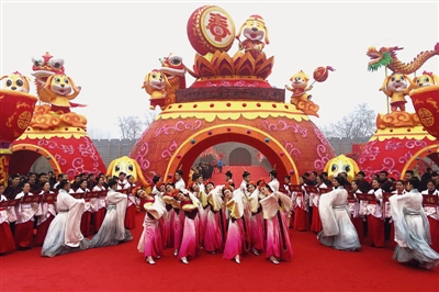 元月1日上午,2018“好客山东”贺年会启动仪式暨第六届台儿庄古城大庙会在古城西门广场拉开帷幕。当天举行了“开福门”大典、“鲁风运河·新年行大运”、传统民间绝活展演等精彩活动,丰富多彩的民俗表演,让游客在新年的第一天大饱眼福。图为“开福门”大典活动现场。 (记者 刘明 摄)