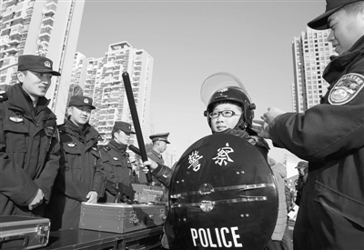 1月10日,在安徽淮北“110宣传日”活动现场,一名小朋友体验警用装备。