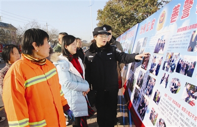 1月10日是全国第32个“110宣传日”。当日上午,滕州市公安局在龙泉广场通过展板、图片、宣传单等形式进行集中宣传。图为民警为市民讲解110常识。 (侯志龙 摄)